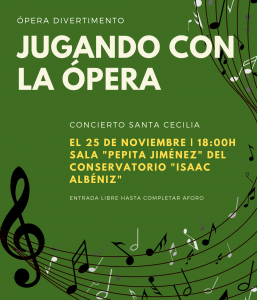 Este 25 de noviembre a las 18:30 tendrá lugar en la Sala “Pepita Jimenez” del Conservatorio “Isaac Albéniz” el Concierto de Santa Cecilia “Jugando con la Ópera”. Previamente al concierto habrá una merienda para toda la comunidad educativa por cortesía del AMPA “Maestro Rodríguez López” (a las 18:00 horas) Concierto de la Compañía Ópera Divertimento. La entrada es libre hasta completar el aforo […]