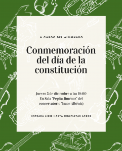 Este 5 de diciembre tendrá lugar en Sala "Pepita Jiménez" el Conservatorio “Isaac Albéniz” la "Conmemoración del día de la constitución" Concierto a cargo de los alumnos del conservatorio. La entrada es libre hasta completar el aforo de la sala.