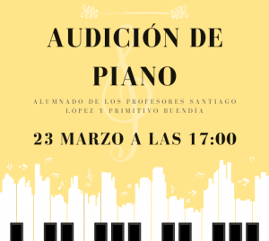 AUDICIÓN DEL ALUMNADO DE PIANO El próximo Lunes 23 de Marzo de 2020 a las 17:00 tendremos la audición de los alumnos de piano.